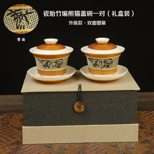 Bamboo Porcelain Panda Gaiwan Teacup Sichuan Province Intangible Cultural Heritage Porcelain Body Bamboo Weaving Handmade Bamboo Art Culture Conference to send guests